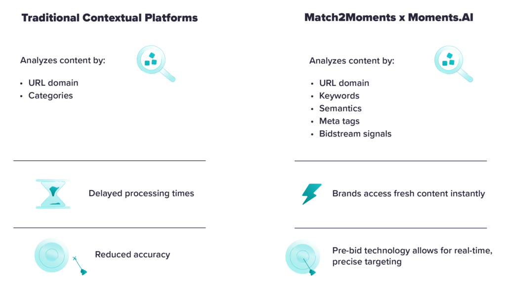 Unlike traditional contextual platforms that crawl the web and classify by URL domain only, Moments.AI (now available via Match2One) identifies relevant content by analyzing many dimensions.