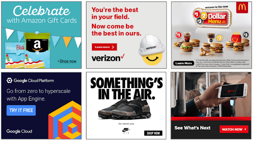 • Be witty – or don’t – it doesn’t seem to matter. A couple of the ads use clever slogans to lure you in (Verizon), while others just tell you straight up what they’re selling (Amazon gift cards)