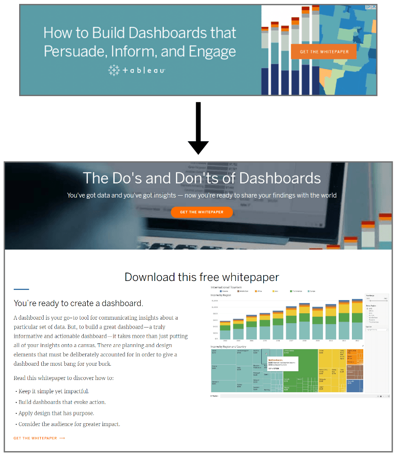 This ad by Tableu offers the viewer a whitepaper in the banner ad – and when you click it you get to a dedicated landing page for that specific white paper.