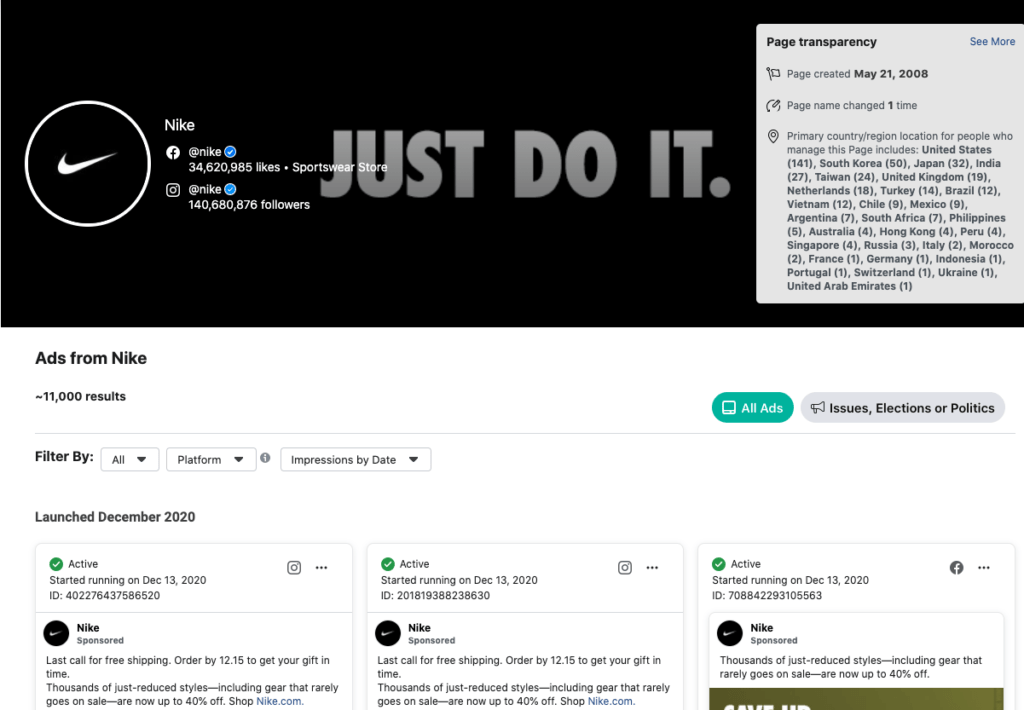 On this page you’ll see all the ads Nike is currently running on Facebook. At the moment, that’s roughly 11,000 different ads in the United States alone. *mind blown*